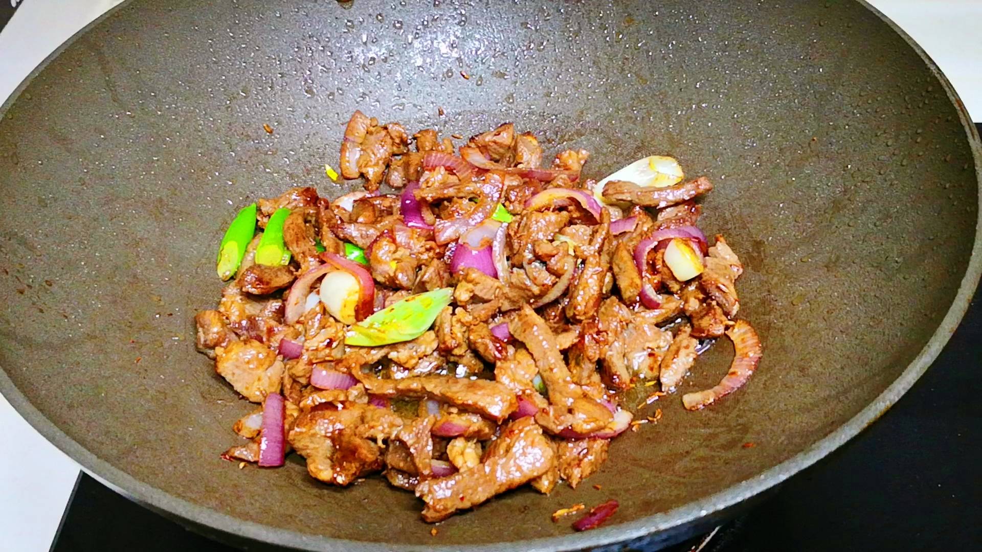 4.锅底留底油,如果不够可以少补一点油,然后下入洋葱和葱段炒香,炒至洋葱变软呈半透明状、出香味后,再将之前炒过的羊肉倒入回锅,翻炒均匀后再加入孜然粒、烧烤料和一点生抽,继续翻炒,让羊肉表面均匀裹满调料,最后出锅前撒上适量的盐调味,翻拌均匀后就可以出锅了!出锅后再撒点小葱花,美味即成!