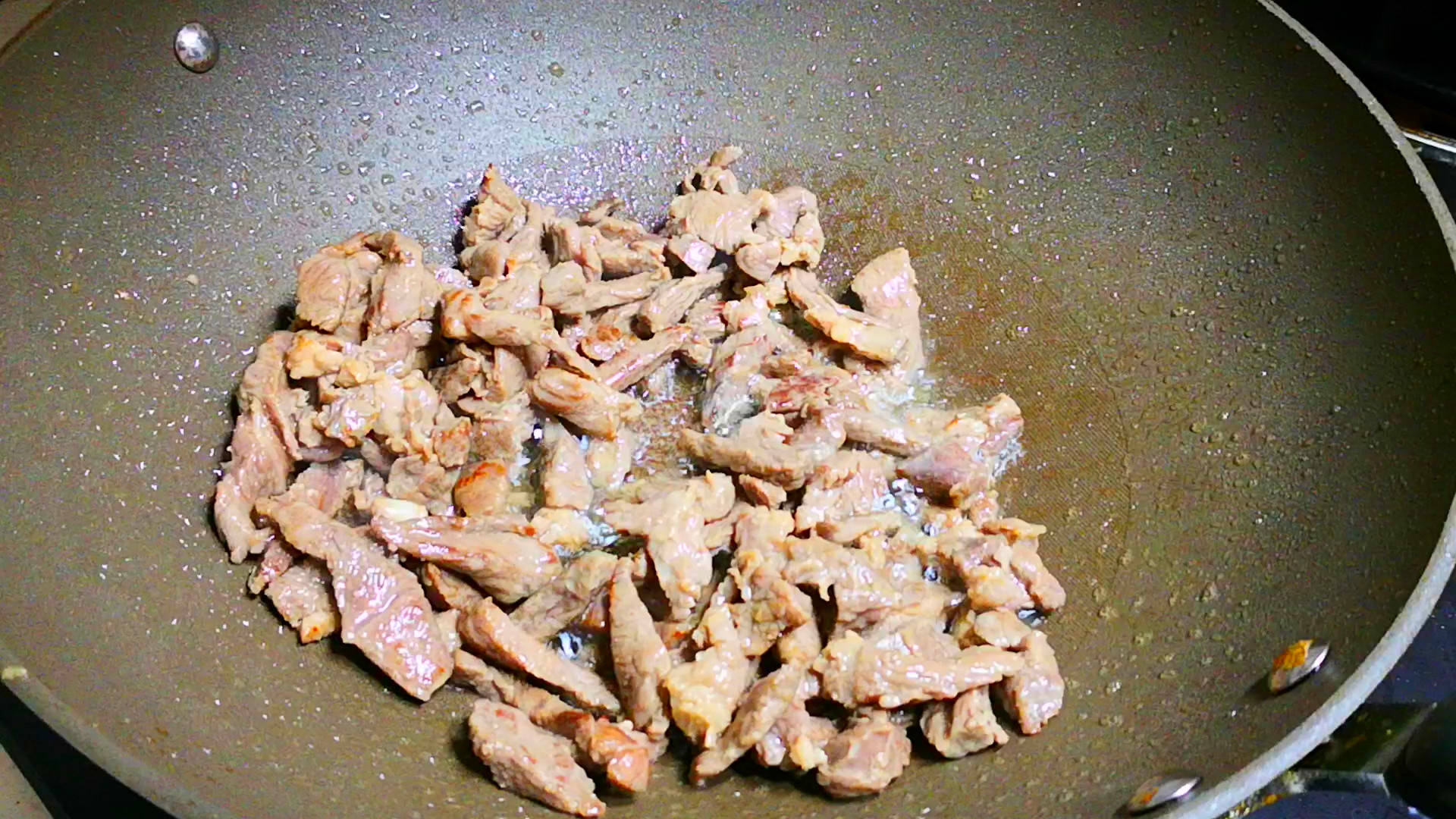 3.起锅倒入适量的食用油,油热以后下入腌制好的羊肉,快速翻炒片刻,炒至羊肉变色后盛出。