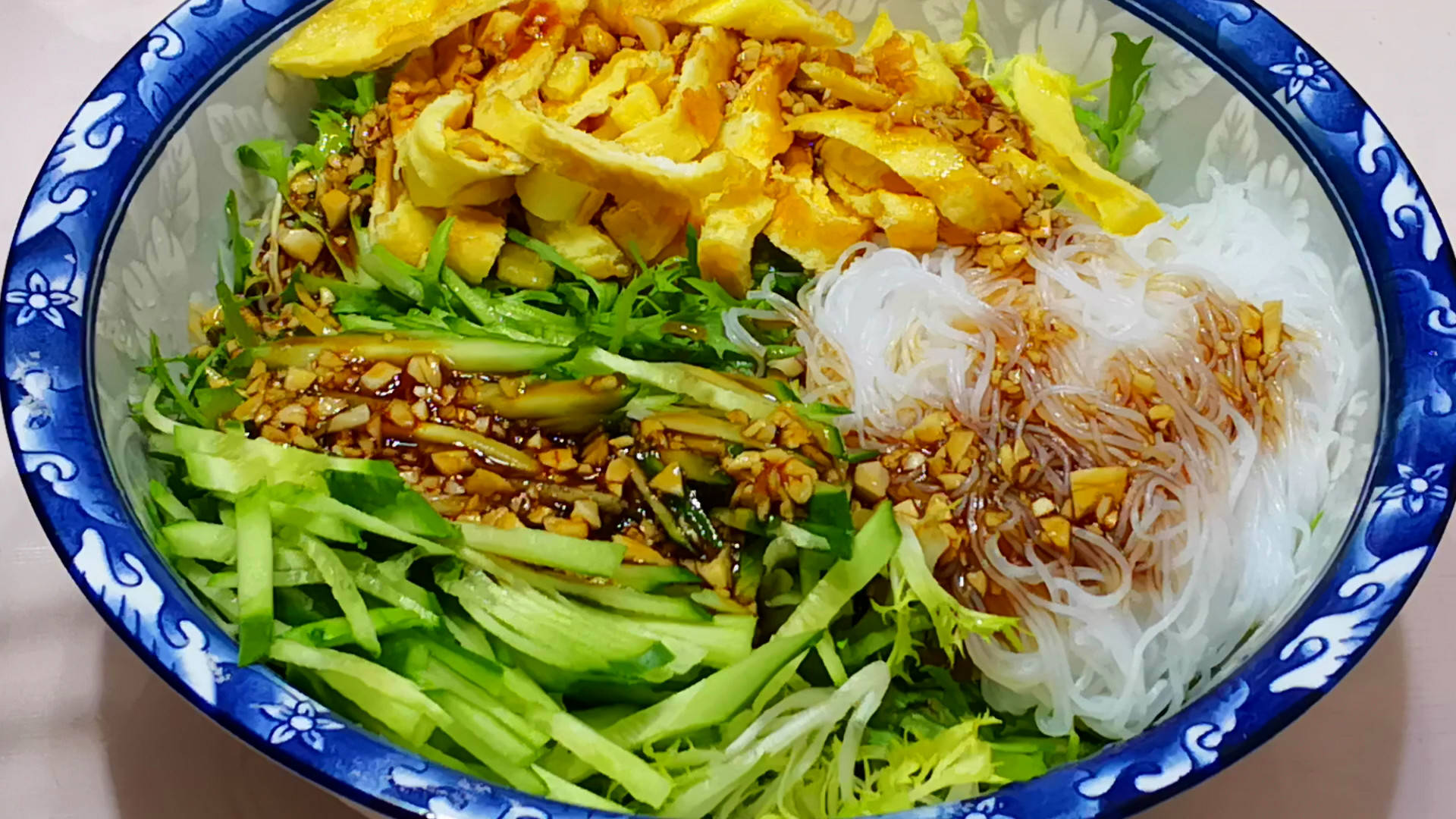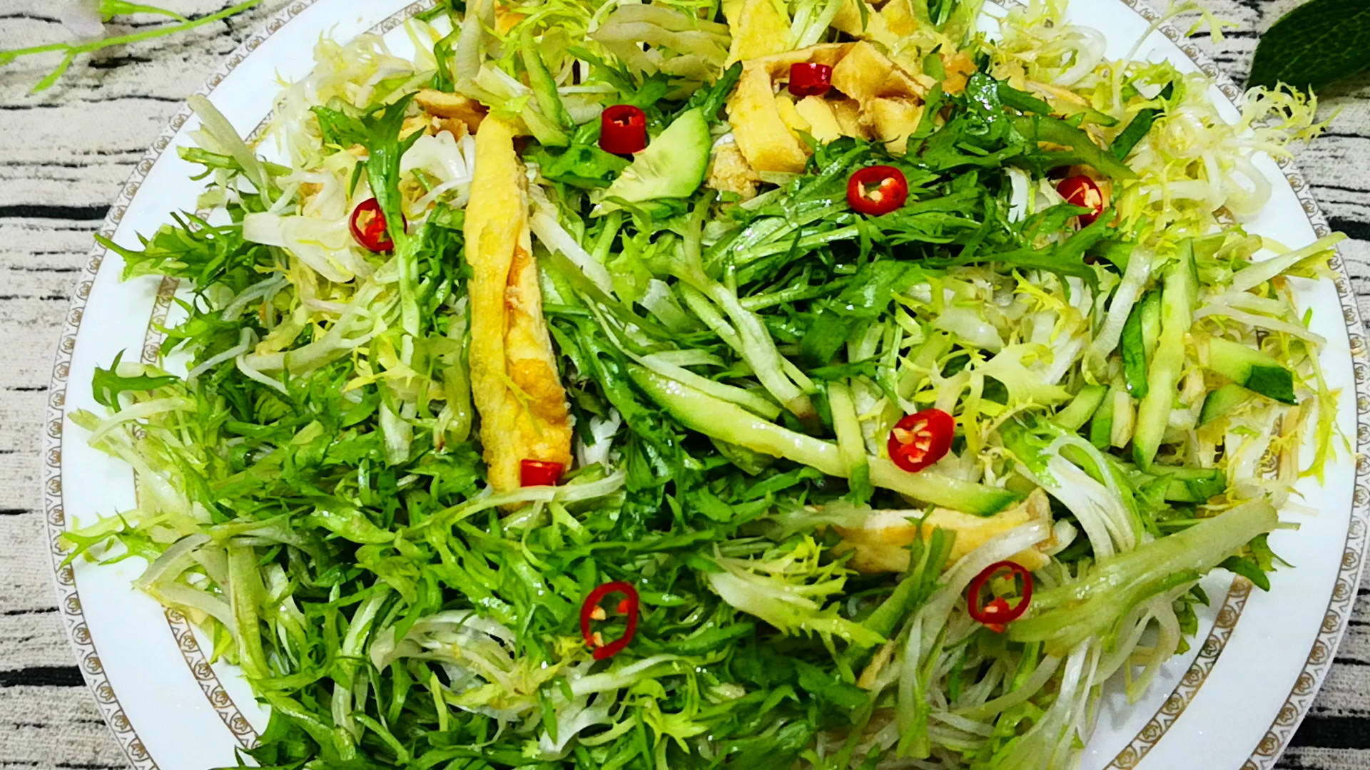 5.捞出苦菊再冲洗一下,然后切成段后放入大碗里,再把粉丝、黄瓜丝和鸡蛋丝也都放入,然后再淋上调好的凉拌汁,搅拌均匀后装入盘中,就可以端上桌美美地享用了,清爽开胃又下饭,太好吃了!