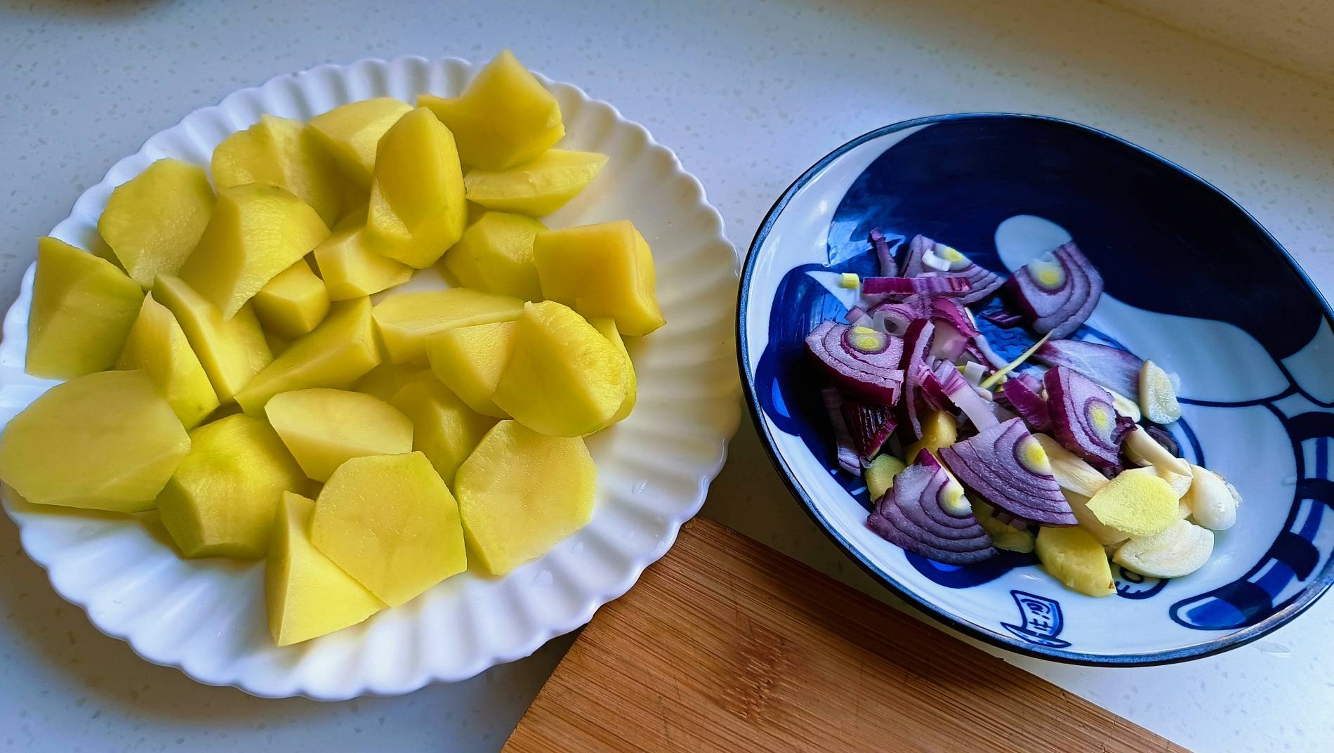 2.洋葱一半切成洋葱丝、3瓣大蒜切成片,一小块生姜切成片备用。