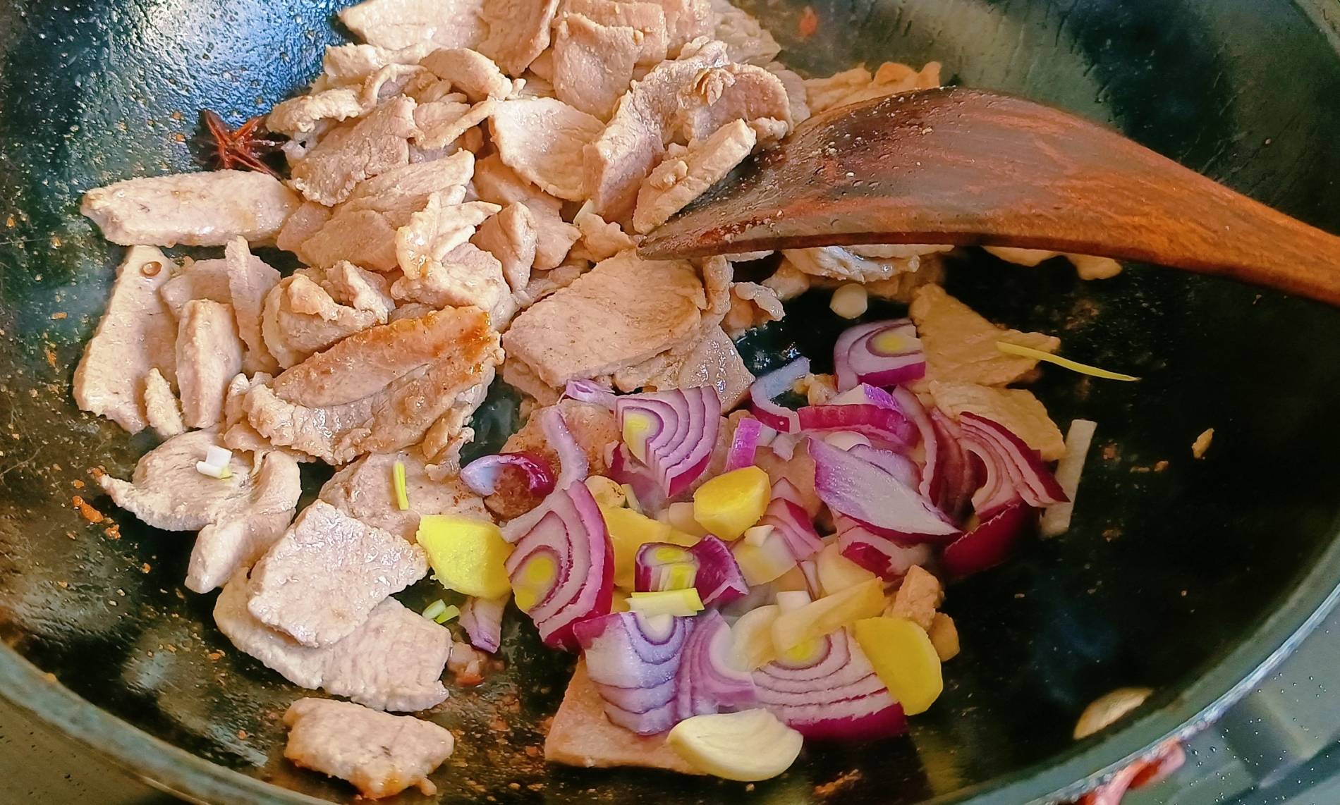 4.起锅加入适量的油,油热后丢入两颗八角,再倒入猪肉片,全程保持大火不停地翻炒,肉要多炒一会儿,很多朋友喜欢炒至猪肉变色后就加水炖,这样炖好的肉腥味会很重。正确的做法是将肉炒至表面微微变焦黄后,再加入半小勺的十三香或是五香粉,很多人排斥十三香,其实爆香后的十三香和五香粉,味道特别赞,跟你想象中的味道完全是不一样的!