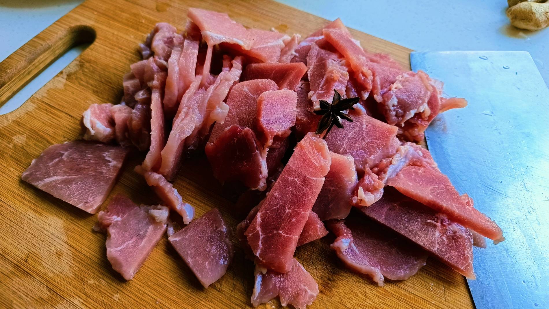 3.400克的猪肉切成硬币厚的肉片,如果能吃肥肉,最好是用肥瘦相间的花肉,我用的是纯瘦的肘肉,因为家里人不吃肥肉,所以口感还是差一点意思的,没有用五花肉香。