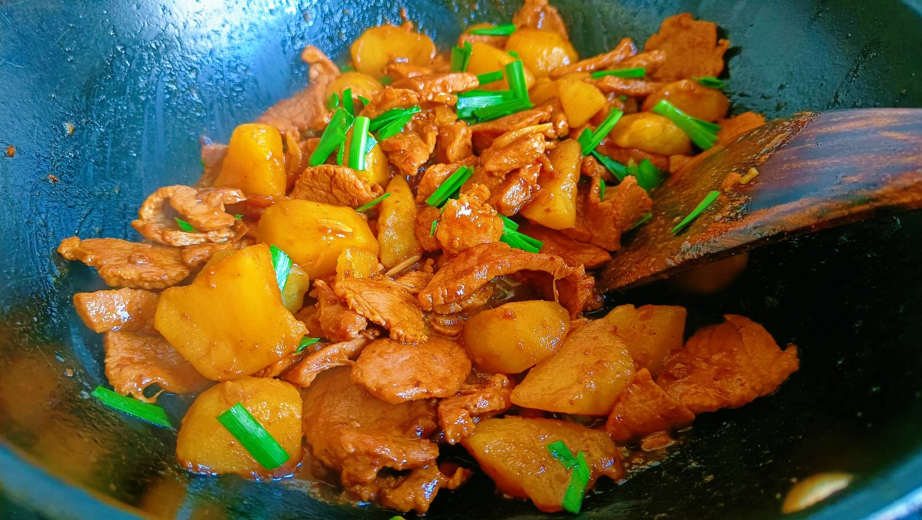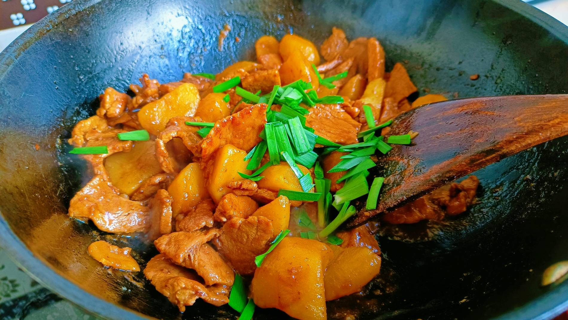 然后再加入葱姜蒜,继续大火翻炒出香味后,再加入2勺生抽,爆出香味后倒入土豆块,大火翻炒2分钟左右,炒至土豆表面油汪汪的时候,开始加水,水是提前用花椒泡的热水,过滤掉花椒后倒入锅中,水量要没过食材,这时再加入1勺黄豆酱或甜面酱、1 勺蚝油提鲜、1勺白糖、半勺老抽调色,搅拌均匀后盖上锅盖。大火烧开后转成小火炖煮15~20分钟左右。