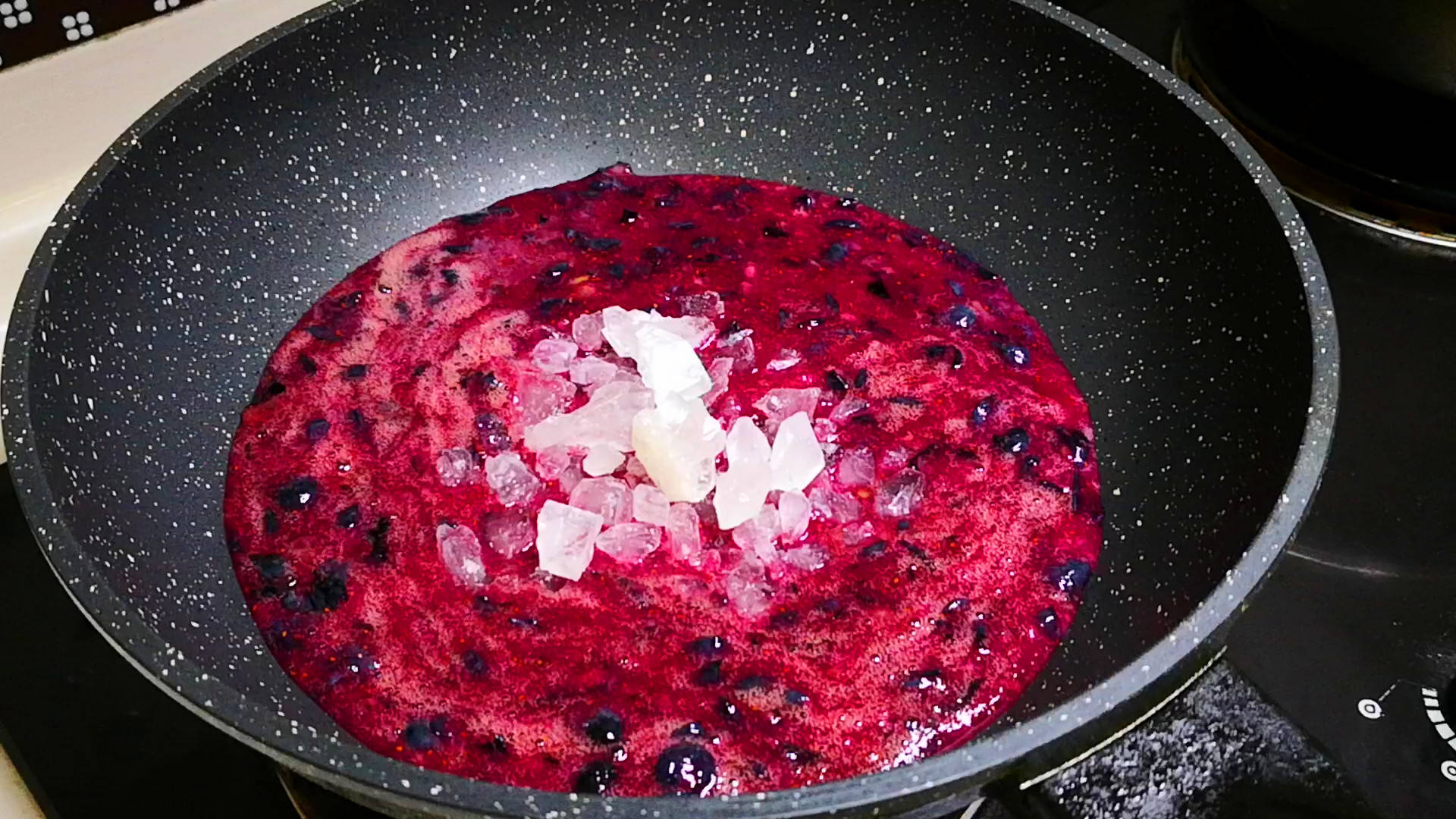 起锅倒入腌制好的蓝莓酱,然后再倒入100克冰糖,用中小火慢慢翻炒熬制,待冰糖完全融化,蓝莓酱的颜色变深变艳时,再将挤出的柠檬汁淋入,这时挤入柠檬汁可以使果酱快速熬煮至粘稠。