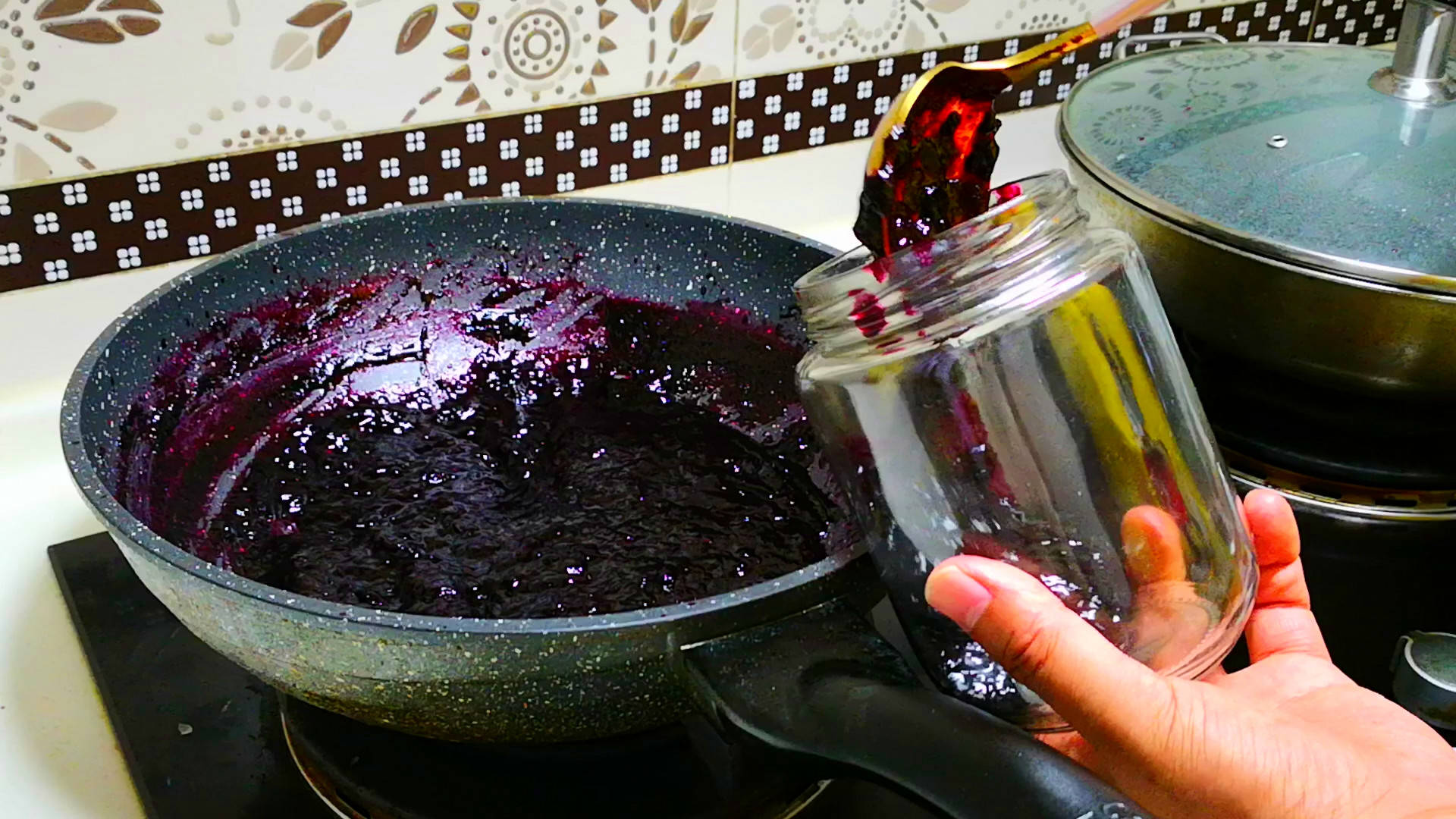 然后用铲子不停地翻炒,防止糊锅,大约煮15~20分钟左右,煮至蓝莓果酱变得粘稠,而且看起来晶莹剔透的时候,蓝莓果酱也就熬好了,关火晾凉即可。