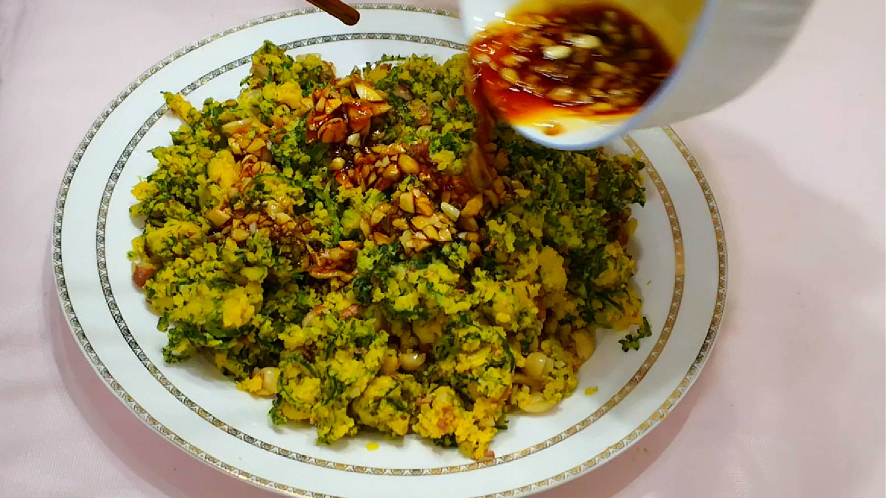 5.大约蒸15分钟左右,将荠菜蒸熟后即可盛出,趁热抖散后,蘸着蘸料就可以食用了,也可以将蘸料倒上拌着吃,鲜香美味!