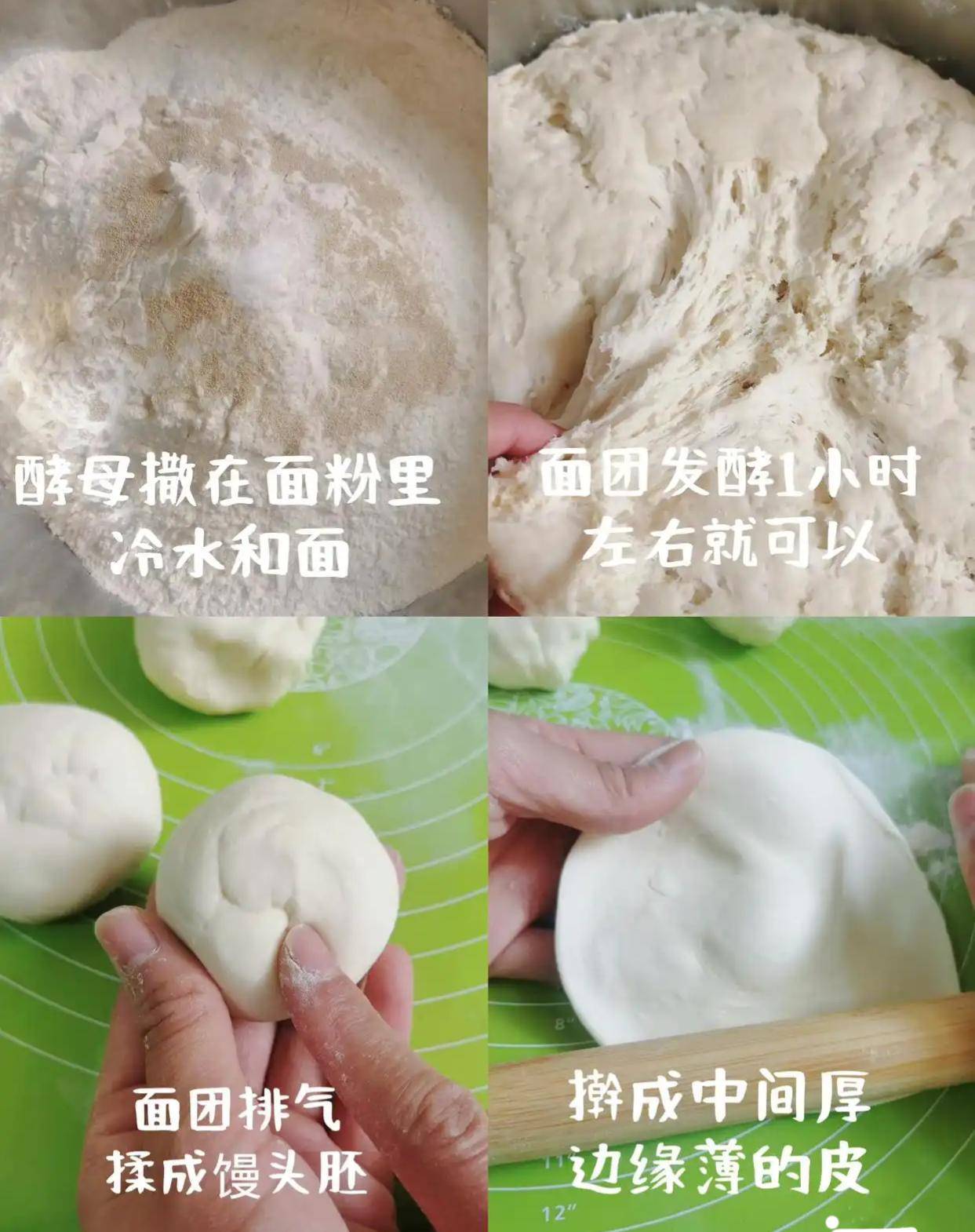 详细步骤:1、和面有讲究:温水化开酵母,加勺白糖能激活酵母。边倒水边用筷子搅成絮状,上手揉到”三光”(盆光手光面光)。夏天盖保鲜膜放阴凉处,冬天坐温水盆里发。