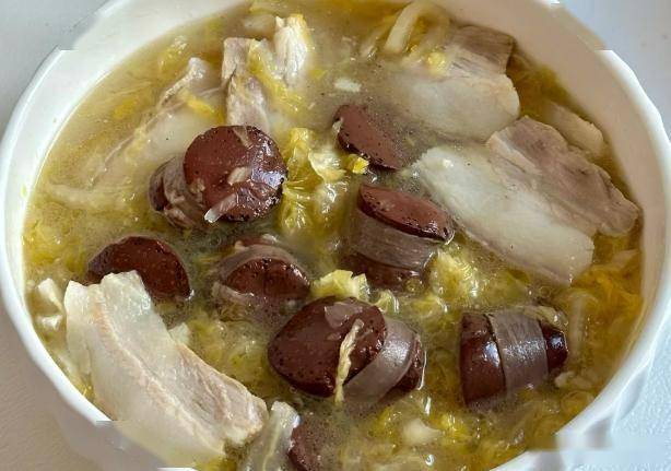 要说东北炖菜里的”扛把子”,必须得是这锅酸菜白肉。自家腌的酸菜切得细丝儿,和五花肉片在骨头汤里翻滚,最灵魂的是那根颤巍巍的血肠——用猪肠衣灌入新鲜猪血,煮到用筷子一戳就滋出红油。老东北人吃这菜有个讲究:得先舀一勺汤把米饭拌成金黄色,这叫”酸菜汤泡饭,给个县长都不换”。