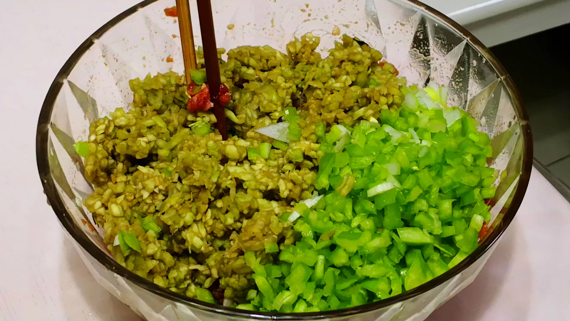 5.茄子腌制好后,用手攥干水分 ,然后放到腌制入味的肉馅中,接着将青椒丁也放入,再加入适量的葱花。