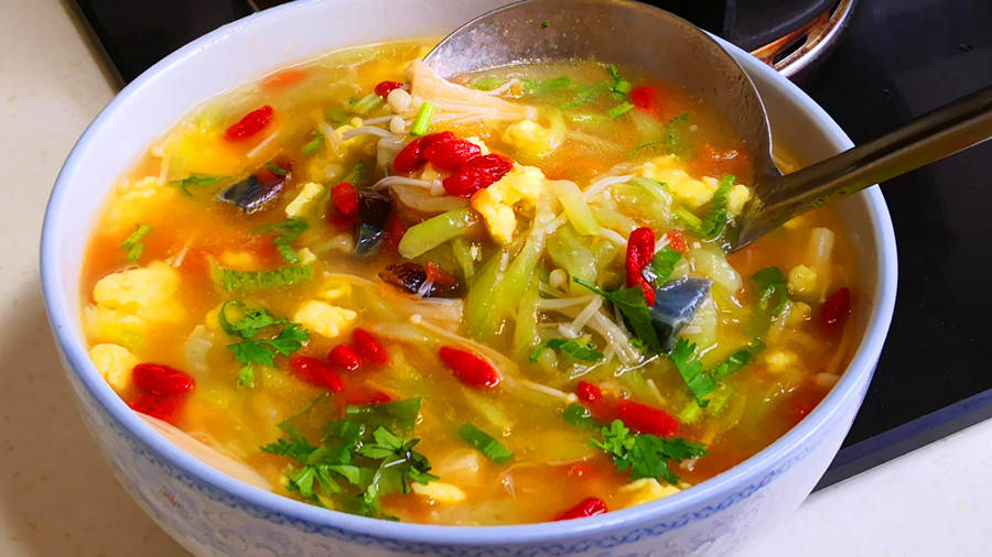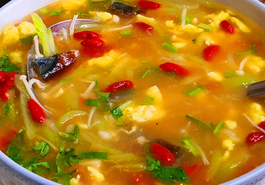 5.大火烧开后继续煮5分钟左右,开锅后淋入适量的水淀粉,煮至汤汁变浓后,再加入一把泡软的枸杞,然后加入盐、胡椒粉、少许香油和鸡精,出锅前撒上一把葱花和香菜,美味即成!