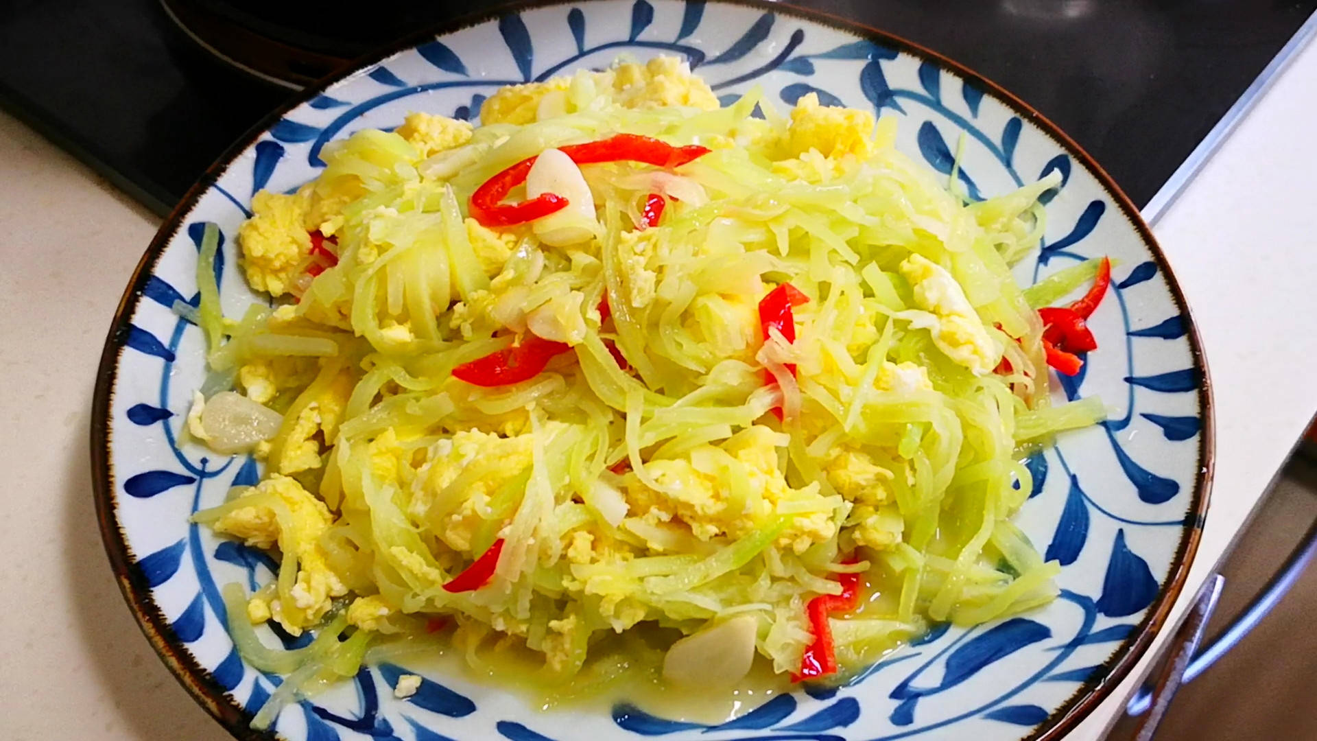4.再起锅加少许油,下入蒜片,炒香后再倒入红椒丝和莴笋丝,翻炒片刻后少加一点米醋,继续翻炒均匀后加入适量的食盐、白糖,一点胡椒粉,再次翻炒均匀后下入鸡蛋块,大火翻炒均匀后就可以出锅装盘了。