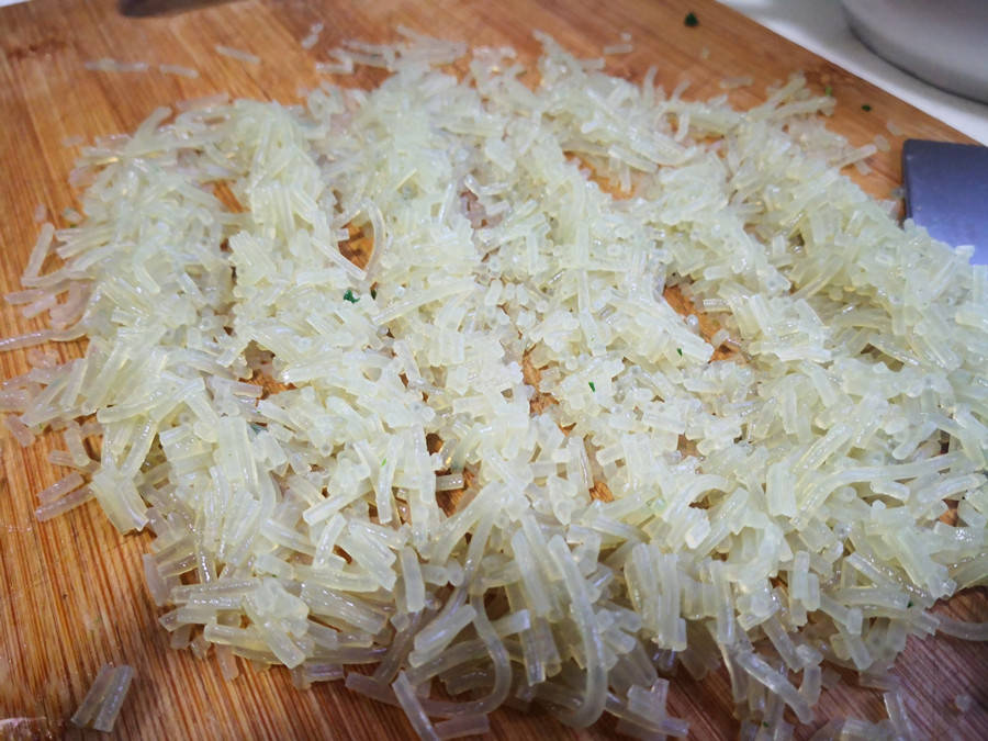 2、另一种方法先将小白菜摘去老叶,掰开后清洗干净,然后切碎剁细放入盆中,加入半勺食盐搅拌均匀刹一下水分,5分钟后挤出小白菜中多余的水分,放入盆中备用;取一把红薯粉条,下锅煮软后捞出过凉水,然后切细备用。
