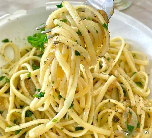 面条沥水后直接甩进油锅,撒一把欧芹碎快速颠锅。这时候面条表面的淀粉水就是天然酱汁黏合剂,比后来再加水淀粉机智多了。