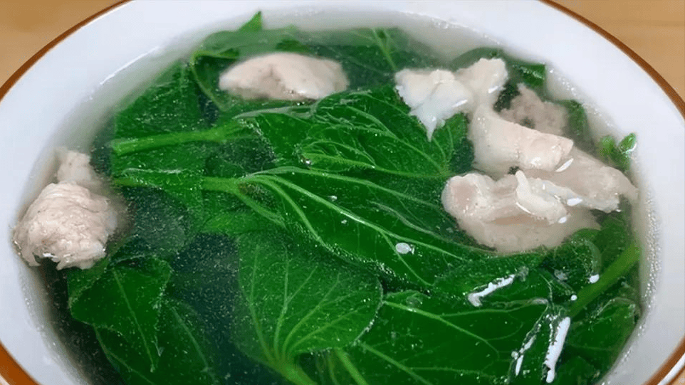 4、整个过程要快!从下红薯叶到关火,也就一分钟左右,保持绿叶的鲜嫩脆爽。看!汤色清亮,红薯叶碧绿舒展,粉嫩的肉片点缀其间,看着就让人口舌生津! 趁热来一碗,那清鲜甘甜的滋味顺着喉咙滑下去,带着一丝姜的暖意和胡椒粉微微的辛香,瞬间抚平了燥热的脾胃。肉片嫩滑得不像话,红薯叶口感清爽独特,吸饱了汤汁的鲜美。这一碗下肚,额头微微冒汗,浑身的黏腻感仿佛都被这碗清新的汤水冲刷干净,舒服极了!