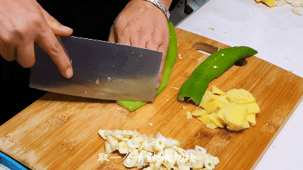 第二步:再准备几个青椒洗净、控干水分后、去籽切成块备用;生姜一块切片备用;大蒜适量切成蒜片备用。