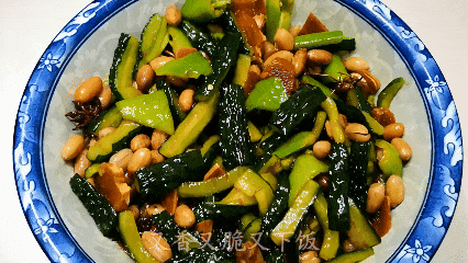 第五步:黄瓜刹出水分后,再用手使劲挤一挤水分,然后放到盆里,倒上切好的青椒块、姜片、蒜片和花生米,最后将凉透的料汁倒入,搅拌均匀后盖上保鲜膜放到冰箱里冷藏腌制即可,2个小时以后就可以吃了,脆爽嘎吧脆,超下饭!