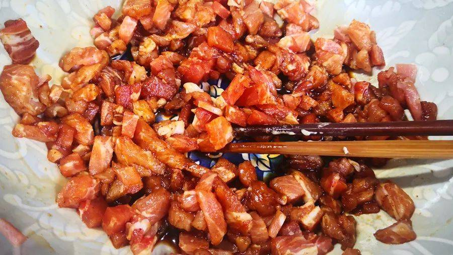 3、准备肉馅:肥瘦相间的五花肉洗净后切成肉丁,这样吃起来口感会更好,然后进行腌制:肉中加入生抽、老抽、蚝油、花椒粉、鸡精、十三香,搅拌均匀后腌制半个小时。如果家里有甜面酱加上一勺,味道会格外香!
