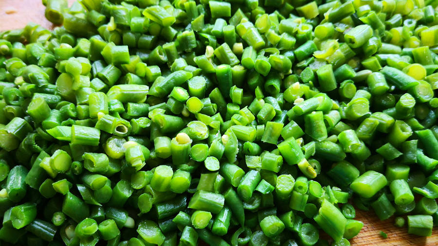 1.取一把鲜嫩的长豆角清洗干净,将两头掰掉不要。起锅烧水,水开后少加点食用油和食盐,可以使豆角的颜色保持翠绿不变。接着下入长豆角给它“洗个热水澡”,烫煮约3分钟左右,看到豆角颜色变绿后就可捞出来了,接着迅速将其放到凉水中过凉,再控干水分,切成小丁备用。