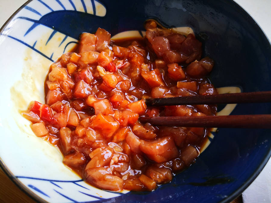2.再准备一块猪肉切成小肉丁后放到碗里,加入适量的生抽、蚝油、料酒、花椒粉和半勺淀粉,下手抓拌均匀后,放一边腌制10分钟左右。给肉丁码味的同时,还能去除肉丁的腥味。