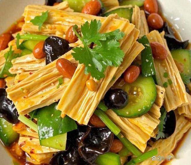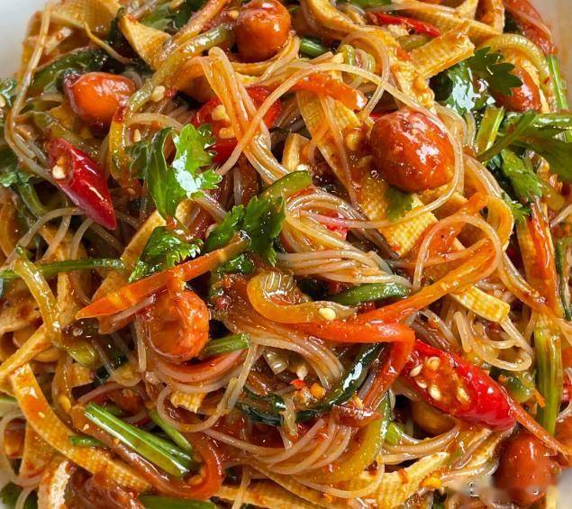 粉丝和豆皮这对CP,简直就是为凉拌而生的!粉丝吸饱了调料汁,豆皮提供嚼劲,再加点胡萝卜丝和紫甘蓝,颜色好看得像彩虹。