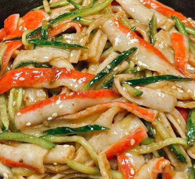 秘诀在于拆蟹柳的手法:把冷冻蟹柳解冻后,顺着纹理撕成细条,这样拌的时候特别容易入味。调味更是简单到犯规: