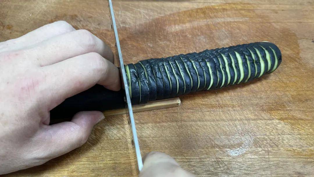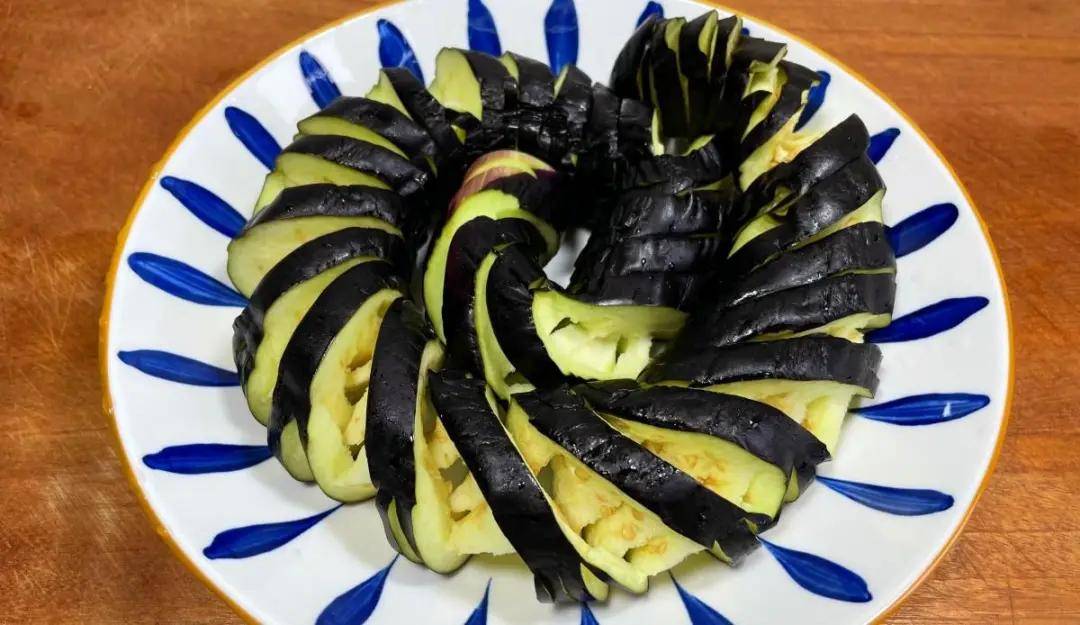 具体做法:1、茄子洗净,切掉头尾。关键一步来了:切蓑衣刀! 在茄子底下垫两根筷子(防切断),先斜着均匀切薄片,切到筷子处停刀。翻个面,同样斜着切薄片。切完轻轻一拉,哇!瞬间变身弹簧小能手,丝丝相连不断开,吸汁儿能力翻倍!