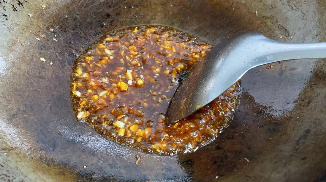 4、炒锅烧热,倒比平时炒菜稍多一点的油(料汁油润才香)。油热后,先把蒜末倒进去一大半! 小火煸炒,眼见着蒜末从白变黄,滋滋作响,香气轰地一下窜出来——就是这时候!赶紧把青红椒丁和剩下的一点生蒜末丢进去,快速翻炒几下,激出生蒜的辛辣。