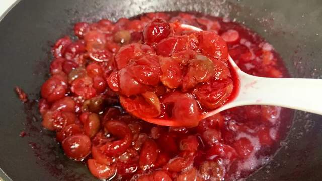 3、很快锅里的樱桃开始变软,渗出红宝石般的汁水,冰糖也渐渐融化。这时候转成小火,拿着勺子轻轻地搅动几下,防止粘锅底,熬上大概15-20分钟,看到樱桃肉变得透亮,整锅糖水变得红润粘稠,咕嘟咕嘟冒着小泡,飘出诱人的甜香,就大功告成啦!