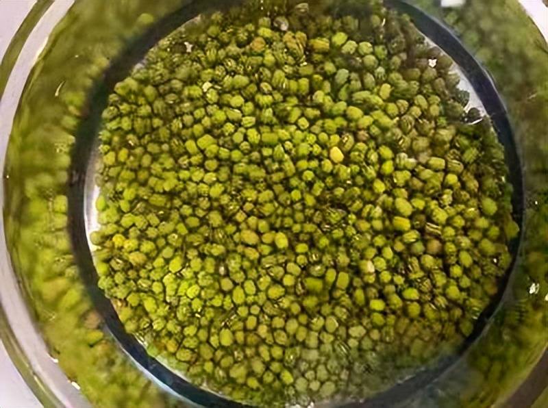 冻绿豆:半个小时后,将泡好的绿豆和水一起放进冰箱中冷冻两个小时以上,这是绿豆煮开花的关键步骤,一定不要省!冻至绿豆和水成冰块状就可以了。