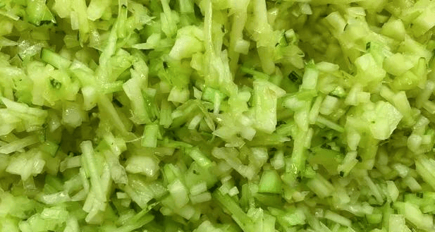 - 西葫芦洗干净,不用去皮(皮很有营养),用擦丝器擦成细丝。重点来了! 在西葫芦丝里加入大约1茶匙的盐,用手轻轻抓匀,静置15-20分钟。盐会把西葫芦里大量的水分“杀”出来。