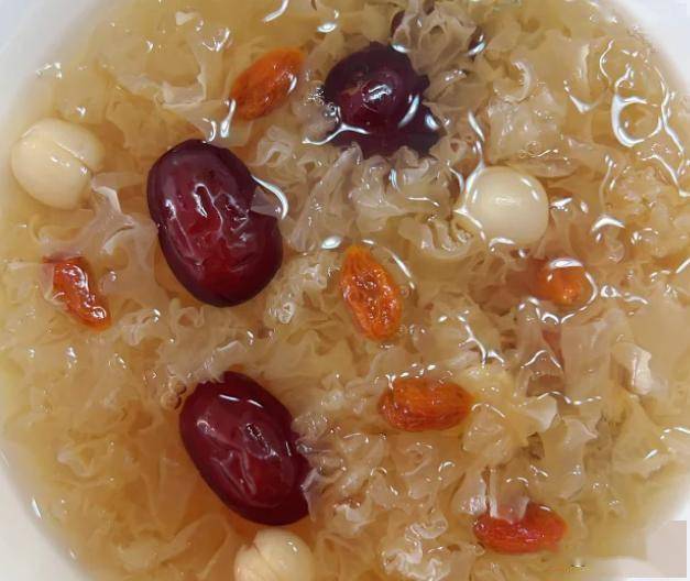 最后这宝可不得了,是甜品界的消暑担当——莲子银耳羹。炖到胶质满满的银耳,配上粉糯的莲子,再撒点枸杞,看着就赏心悦目。