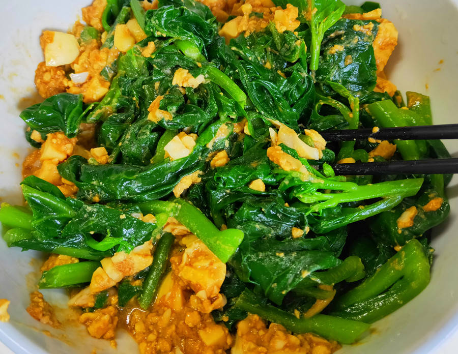 拌鸡蛋木耳菜:准备比平时凉拌菜稍微多一些的大蒜,去皮后捣成蒜泥,盛出放入碗中,再将凉透的鸡蛋也放入,将鸡蛋用勺子按压成鸡蛋碎后,再加入适量的生抽、香醋、少许香油,搅拌均匀后,再把木耳菜倒入,继续搅均后,就可以装盘了,美味即成!