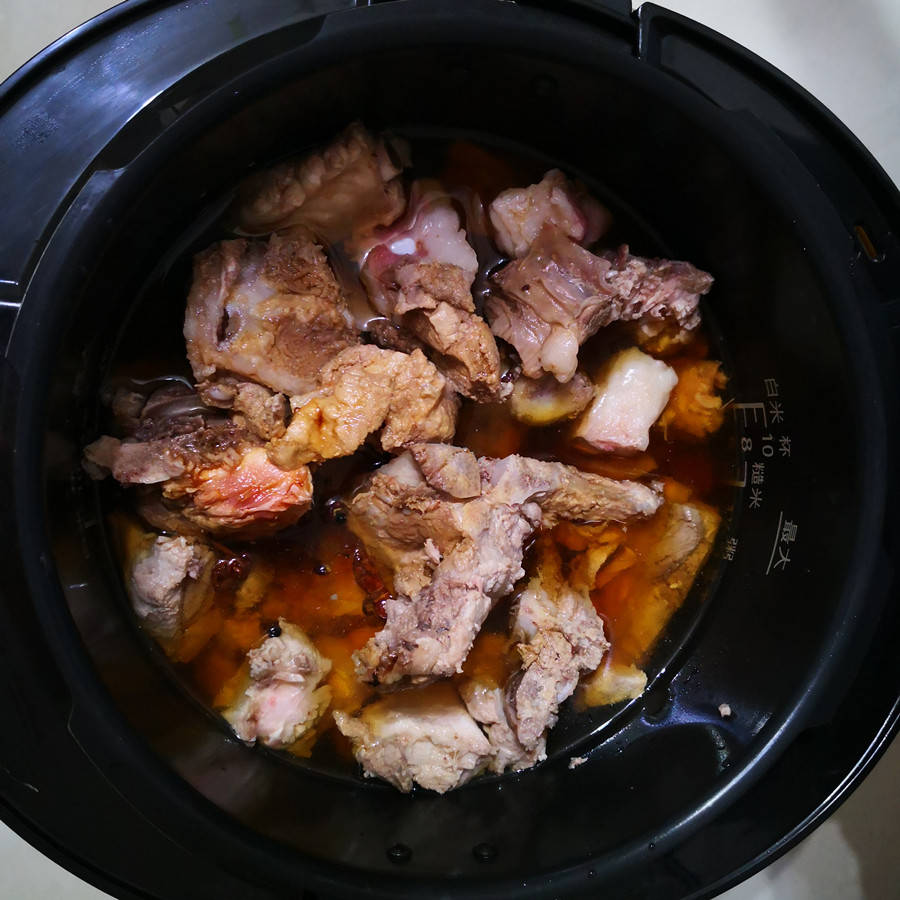 2、准备馅料:排骨洗净后剁成2厘米的小段,起锅加水倒入排骨,焯至排骨变色后关火,捞出排骨清洗干净,再放到压力锅中,加入食盐1匙、酱油2勺、料酒3勺、适量白糖、蚝油、花椒、八角和葱姜调味,然后炖煮20分钟左右;茄子洗净后先切片再切条,然后切成小丁备用。