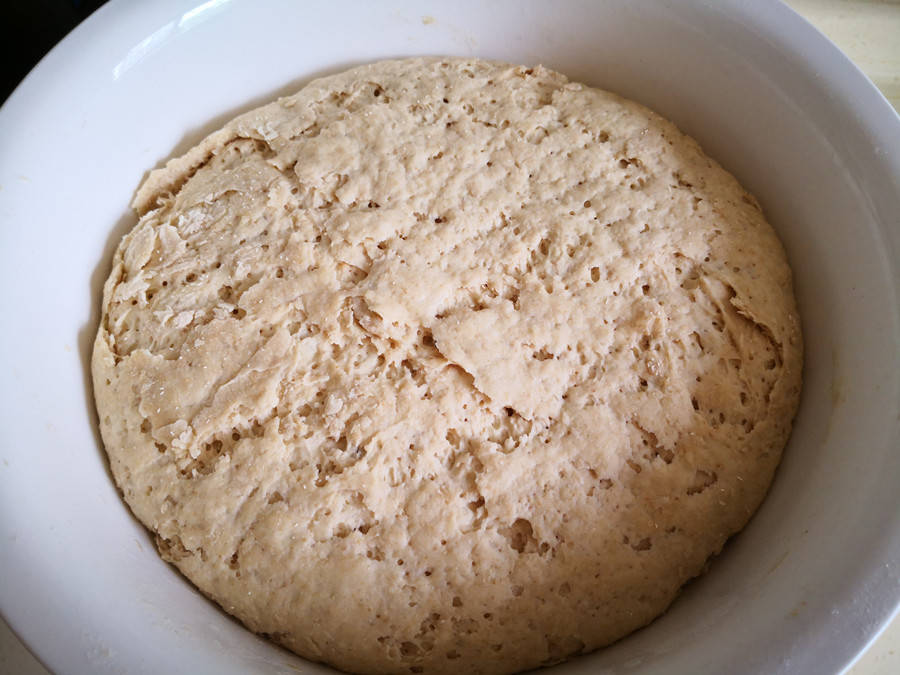 1、调面:5克酵母粉放在温水中化开,接着,将酵母水慢慢倒入面粉中,然后开始和面,一边加水一边搅拌,直到面粉形成絮状。然后,用手把絮状面粉揉成一个光滑的面团,盖上保鲜膜,放置在温暖的地方发酵。一般来说,夏天室温较高,发酵一个小时左右,面团就会膨胀到原来的两倍大。当你用手指在面团上戳一个洞,洞口不回缩,就说明面团发酵好了。