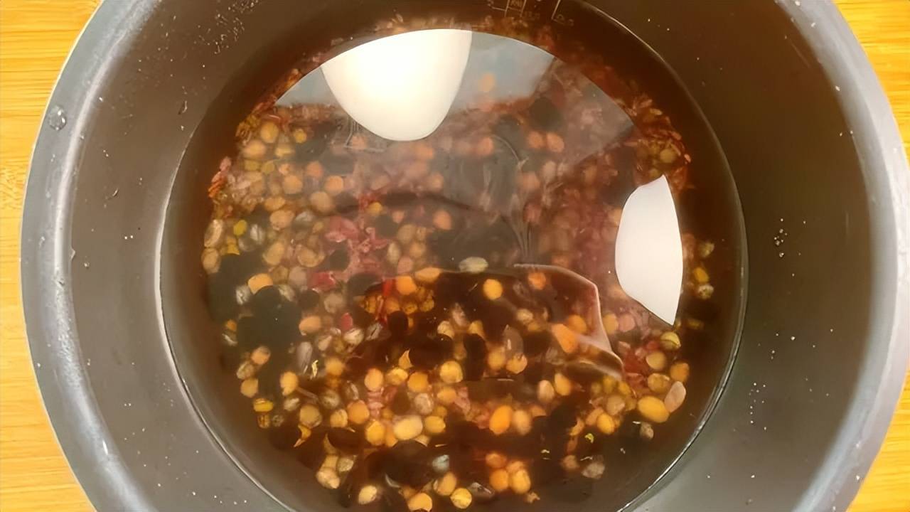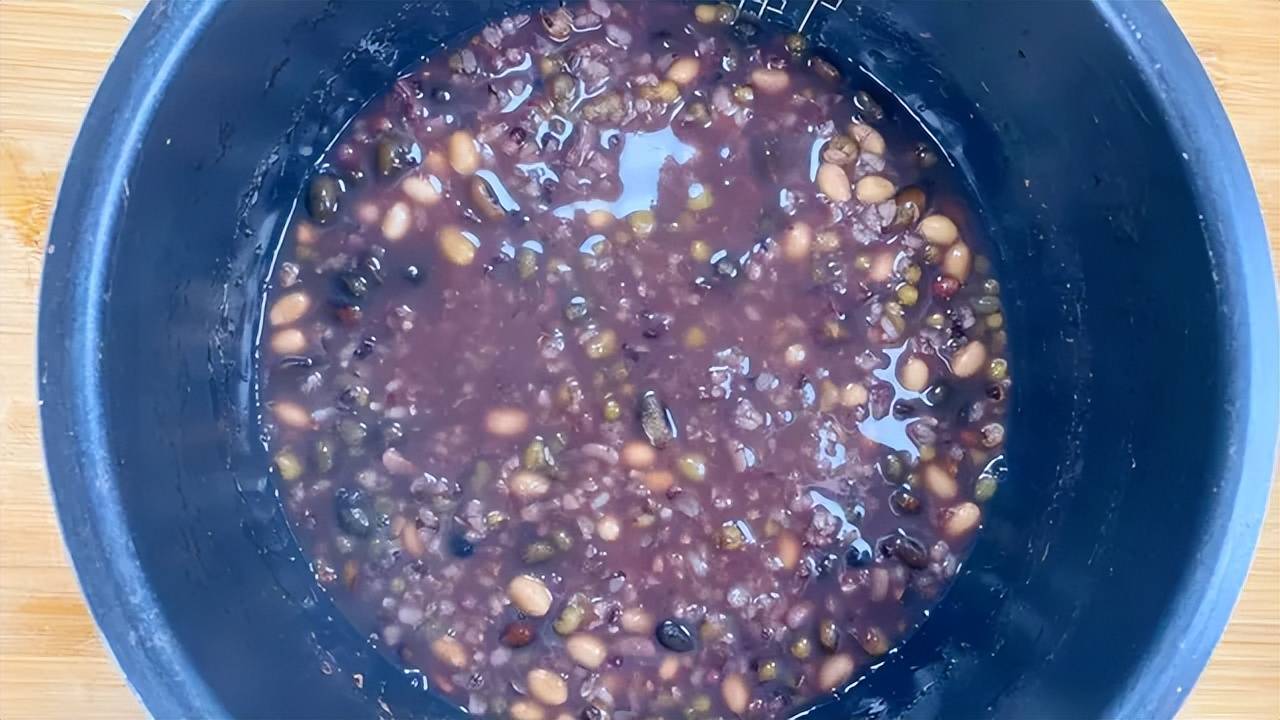 5、开盖见真章! 哇!香气扑鼻!看看豆子们,黑豆红豆应该已经咧嘴笑了(开花了),绿豆也沙沙的,糙米吸饱了汤汁,软软糯糯。汤可能变得比较浓稠,这正是你想要的效果!