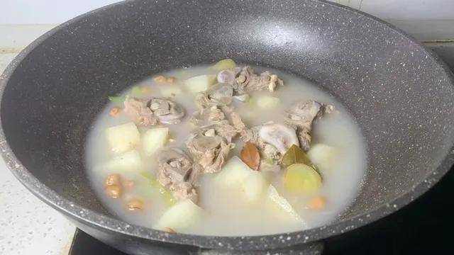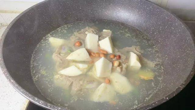 3、时间到后,将沙葛块倒入锅中,喜欢花生的这时也可以加一小把进去。继续煲煮约30分钟,直到沙葛变得半透明,用筷子能轻轻戳透。最后调入适量盐,撒上点葱花点缀即可关火。