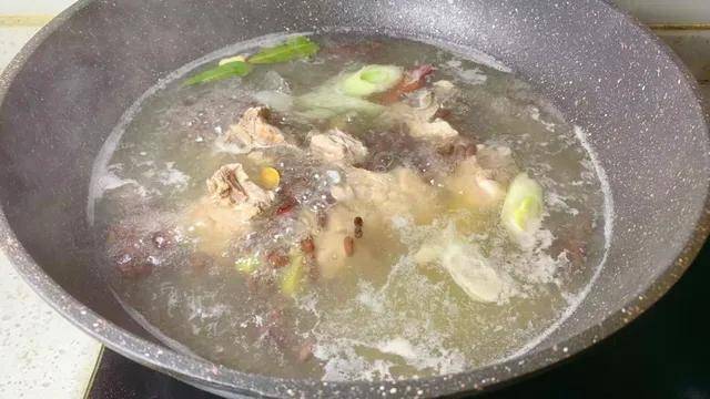 3、加入处理好的土茯苓和泡好的红豆。再次大火烧开后,转最小火,盖上锅盖,慢炖至少1.5小时。时间是最好的调味剂,耐心等待醇香释放。炖够时间后,汤色变得浓郁醇厚,香气四溢。此时加入山药块。继续盖上盖子,小火炖煮20-30分钟,直到山药软糯。