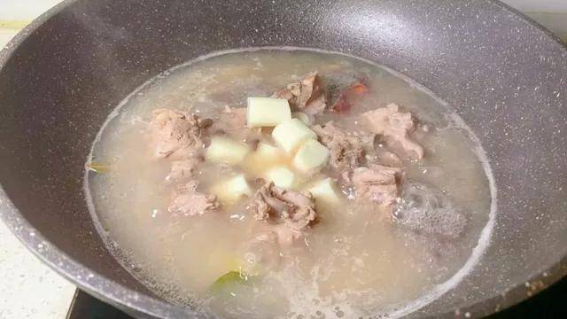 2、锅烧热,倒入少许油(用猪油更香!),下姜片、葱段、八角、香叶、干辣椒(怕辣可掰开去籽),中小火煸炒出浓郁香气。放入焯好水的大骨头,继续煸炒几分钟,炒到骨头表面微微焦黄,烹入1勺料酒,酒气蒸腾带走腥味。一次性加入足量热水(汤好喝的关键一:加热水,汤更浓白),水量要没过所有食材并高出许多。大火烧开,撇干净浮沫。