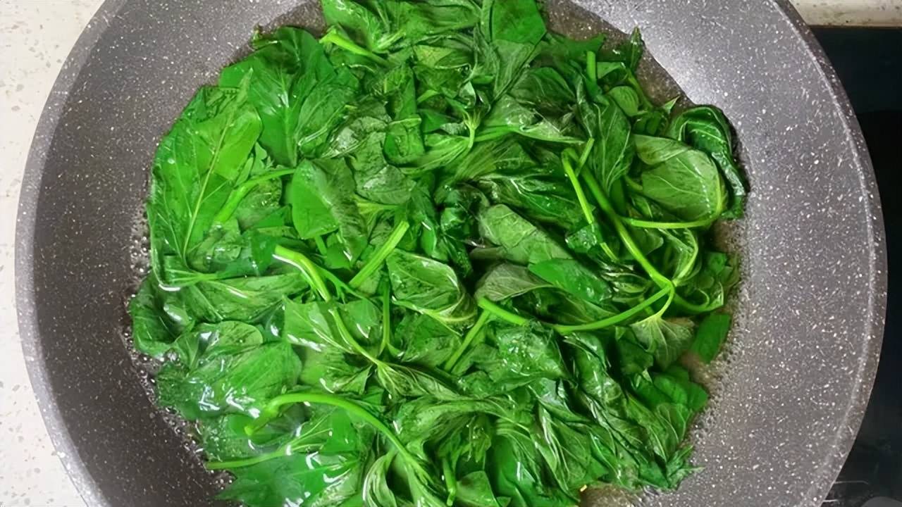 2、锅里水烧开,滴几滴食用油(这样焯出来颜色更鲜亮)。红薯叶倒进去,别犹豫,用筷子快速扒拉几下,眼瞅着叶子全都变软、颜色变得更翠绿了,立马捞出!也就十几二十秒的事儿,久了就蔫了没精神。捞出来马上过两遍凉白开,给叶子降降温,保住那股子脆劲儿,然后攥干水分,松松地堆在盘子里。