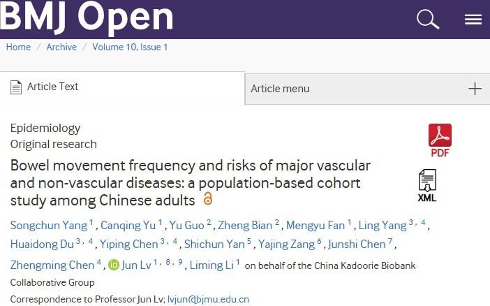 这项发表在《BMJ Open》期刊上的大型前瞻性队列研究,以中国10个地理区域的487198名成人为研究对象,平均年龄51.5岁,随访周期长达10年。研究员将受试者按排便频率分为四组,通过长期数据追踪发现,排便频率过高或过低,都与多种重大疾病风险显著相关,打破了“排便越勤越健康”的固有认知。