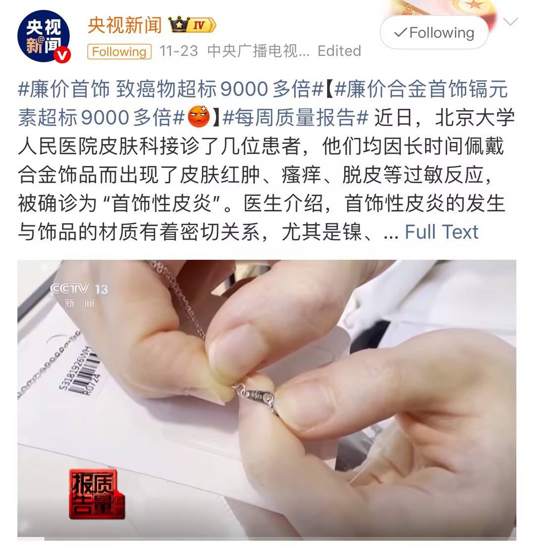 爱美之心人皆有之,颈间的项链、腕间的手镯、耳畔的耳钉,总能为穿搭添彩。但北京大学人民医院皮肤科医生近期怒斥,市面上不少廉价首饰暗藏致命风险,部分样品致癌物超标竟达9000多倍,长期佩戴无异于给健康埋雷。以下4种首饰,劝你立刻停用。