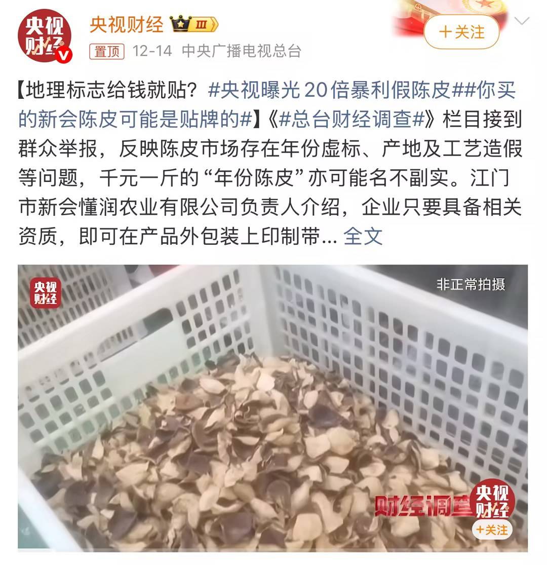 近日,央视《财经调查》栏目重磅曝光陈皮市场乱象,产地造假、年份速成、地理标志滥用等问题触目惊心。号称千元一斤的“十年新会陈皮”,成本可能仅70元,市场上八成所谓“新会陈皮”实为广西等地的冒牌货,让不少消费者直呼踩坑。陈皮作为药食同源的佳品,养生之余,这些避坑要点务必牢记。