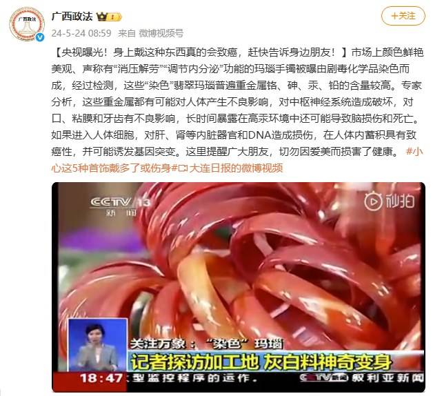 第三种,染色玉石饰品。玉石象征着温润典雅,一直深受大众喜爱,但天然玉石价格偏高,让不少人望而却步。近年来,市场上出现了大量价格低廉、色彩艳丽的“玉石”首饰,很多人以为是“性价比之王”,实则是商家的骗局。这些饰品大多以灰白玛瑙为原料,经过人工染色处理而成,而染色剂中含有硝酸银、硝酸钠、硝酸钾等有毒物质。长期佩戴,染色剂会随着皮肤汗液的浸润慢慢析出,接触皮肤可能引发过敏、红肿、瘙痒,长期渗透还会影响人体代谢,损害身体健康。